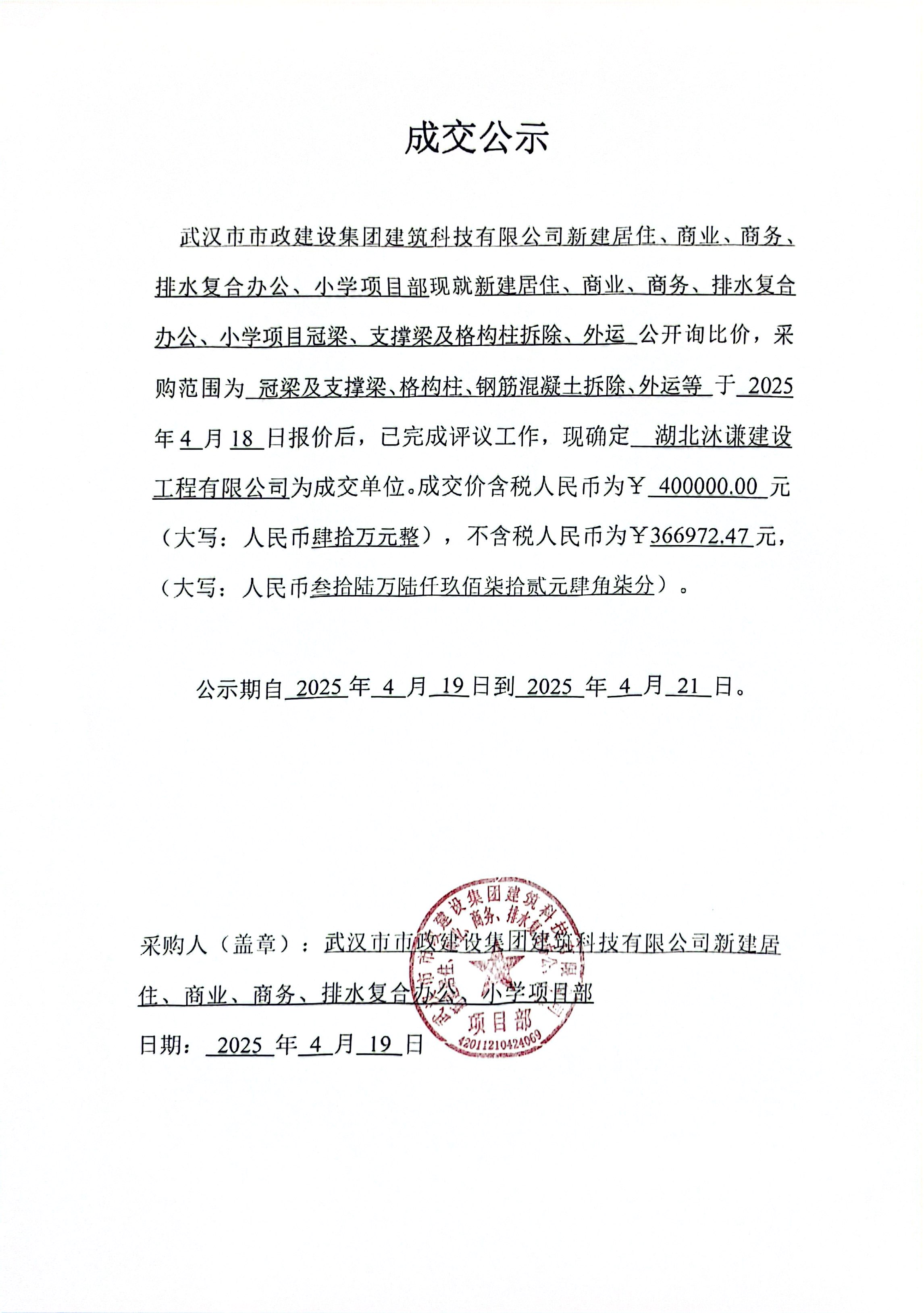 武漢市市政建設(shè)集團(tuán)建筑科技有限公司新建居住、商業(yè)、商務(wù)、排水復(fù)合辦公、小學(xué)項目冠梁、支撐梁及格構(gòu)柱拆除、外運成交公示