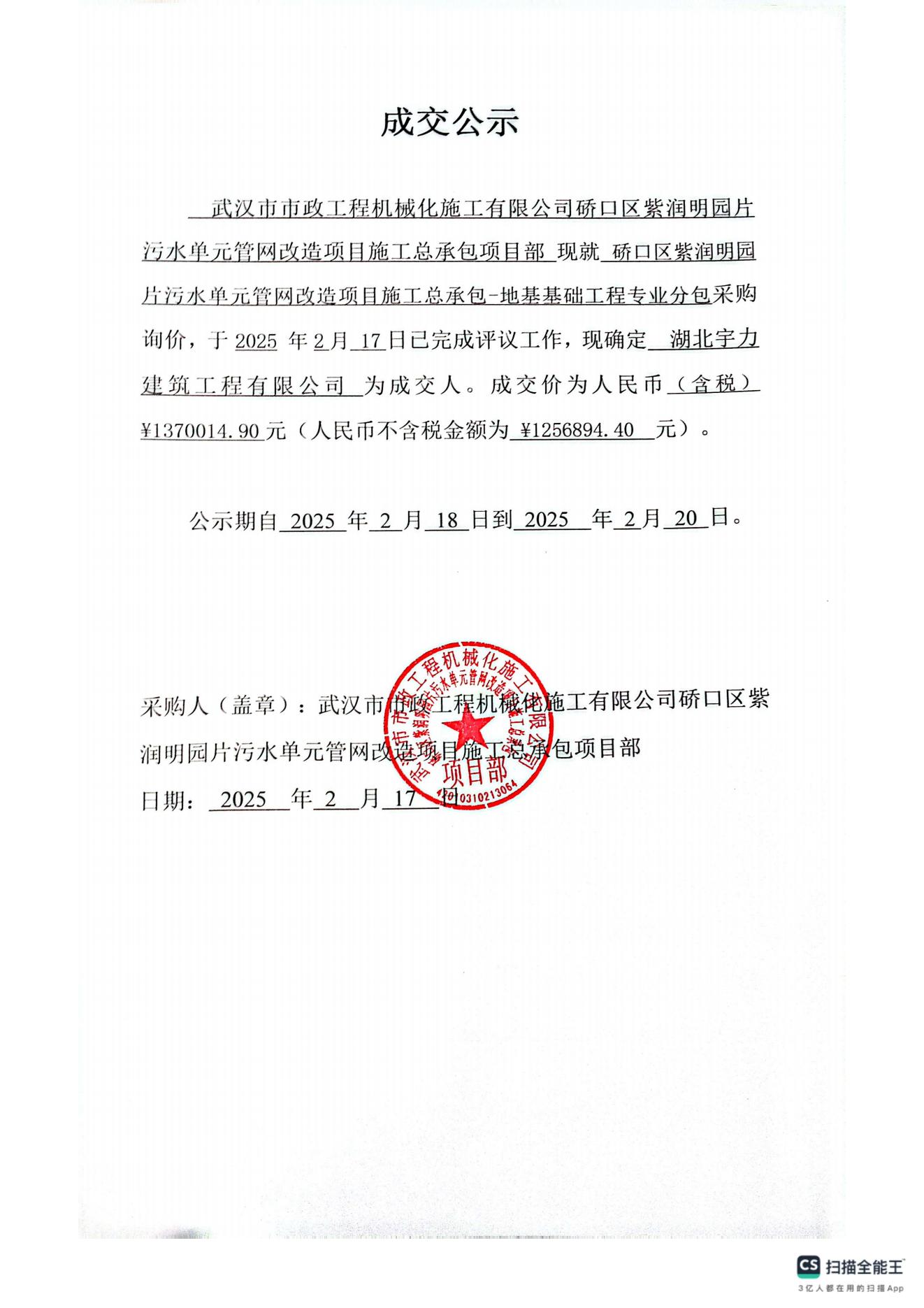 硚口區(qū)紫潤明園片污水單元管網(wǎng)改造項(xiàng)目施工總承包-地基基礎(chǔ)工程專業(yè)分包成交公示