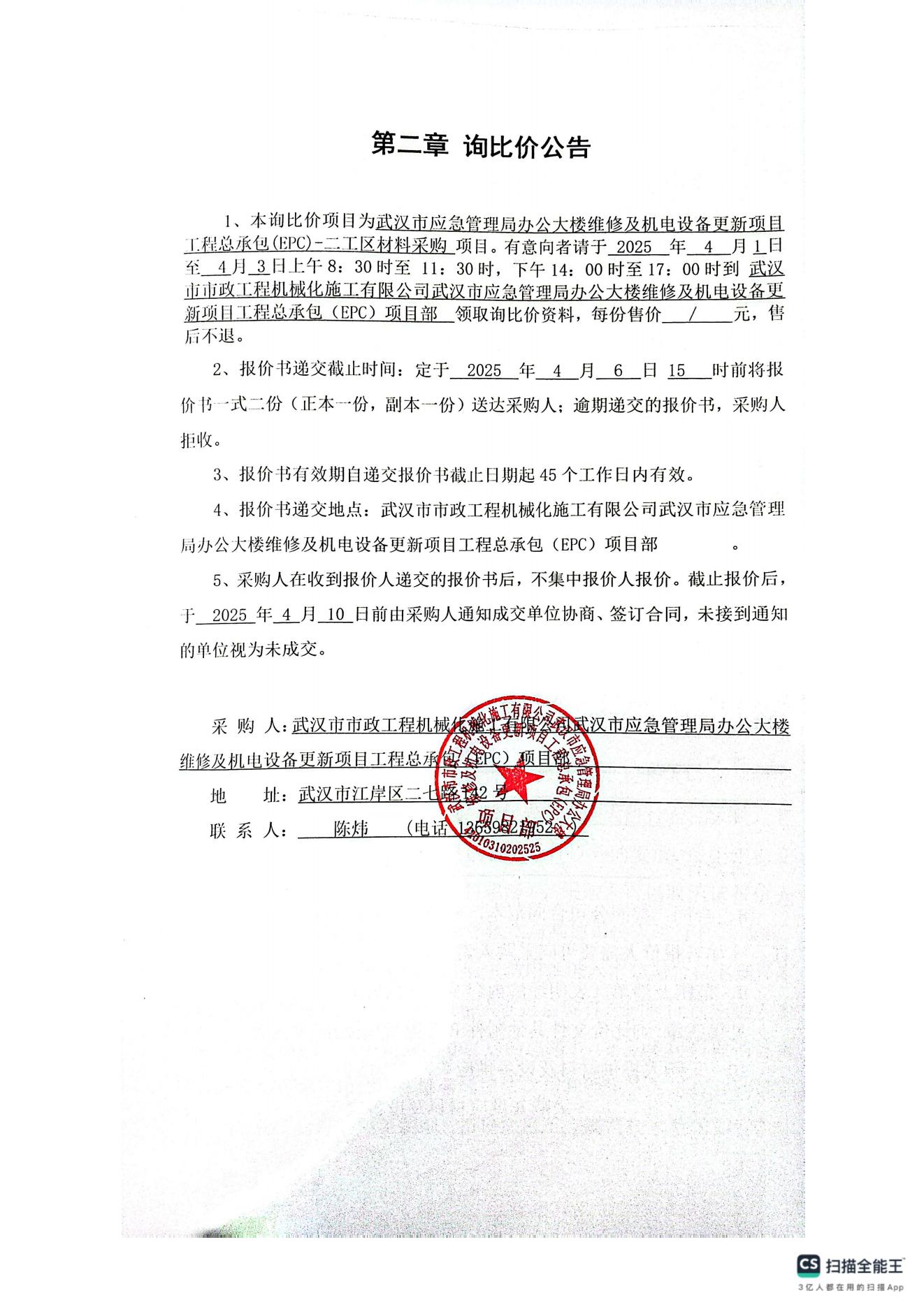 武漢市應(yīng)急管理局辦公大樓維修及機(jī)電設(shè)備更新項(xiàng)目工程總承包(EPC)-二工區(qū)材料采購(gòu)詢價(jià)公告