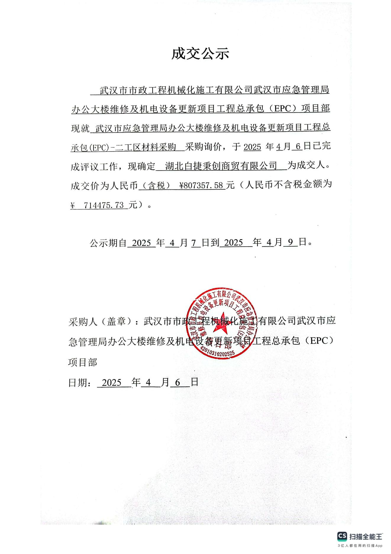 武漢市應(yīng)急管理局辦公大樓維修及機電設(shè)備更新項目工程總承包(EPC)-二工區(qū)材料采購成交公示