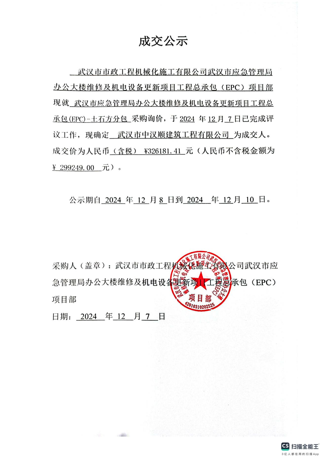 武漢市應(yīng)急管理局辦公大樓維修及機(jī)電設(shè)備更新項(xiàng)目工程總承包(EPC) -土石方分包成交公示