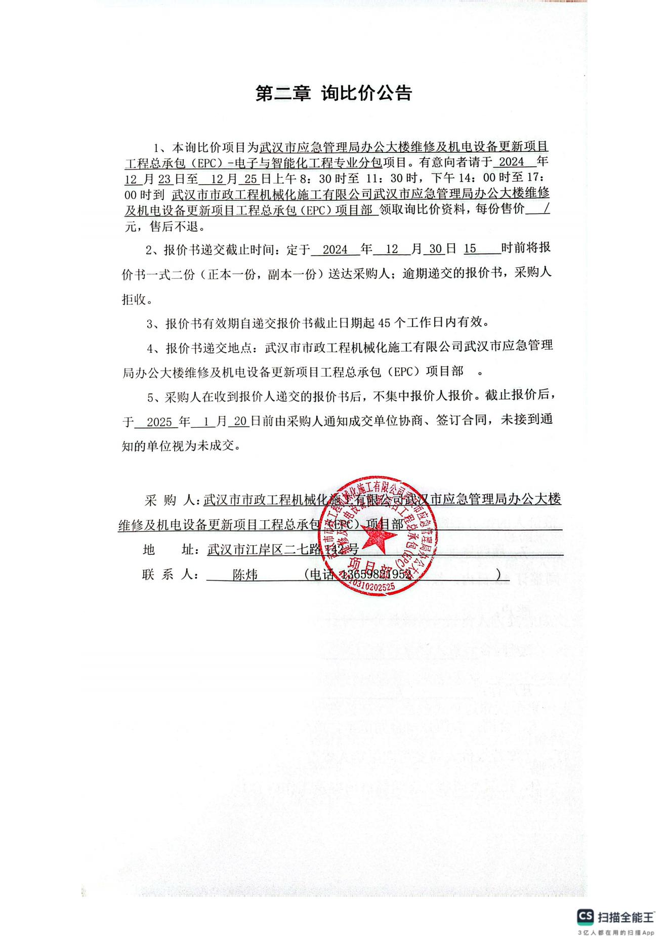 武漢市應(yīng)急管理局辦公大樓維修及機(jī)電設(shè)備更新項(xiàng)目工程總承包(EPC)-電子與智能化工程專業(yè)分包詢價(jià)公告