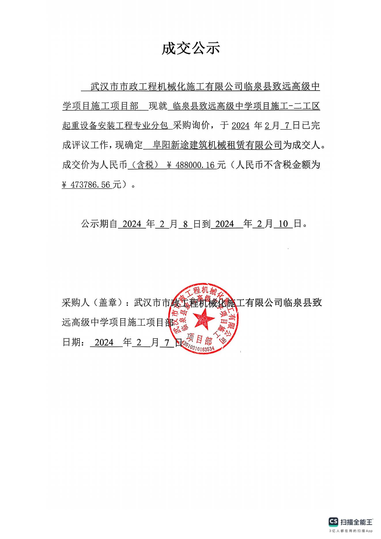 臨泉縣致遠高級中學項目施工-二工區(qū)起重設(shè)備安裝工程專業(yè)分包成交公示