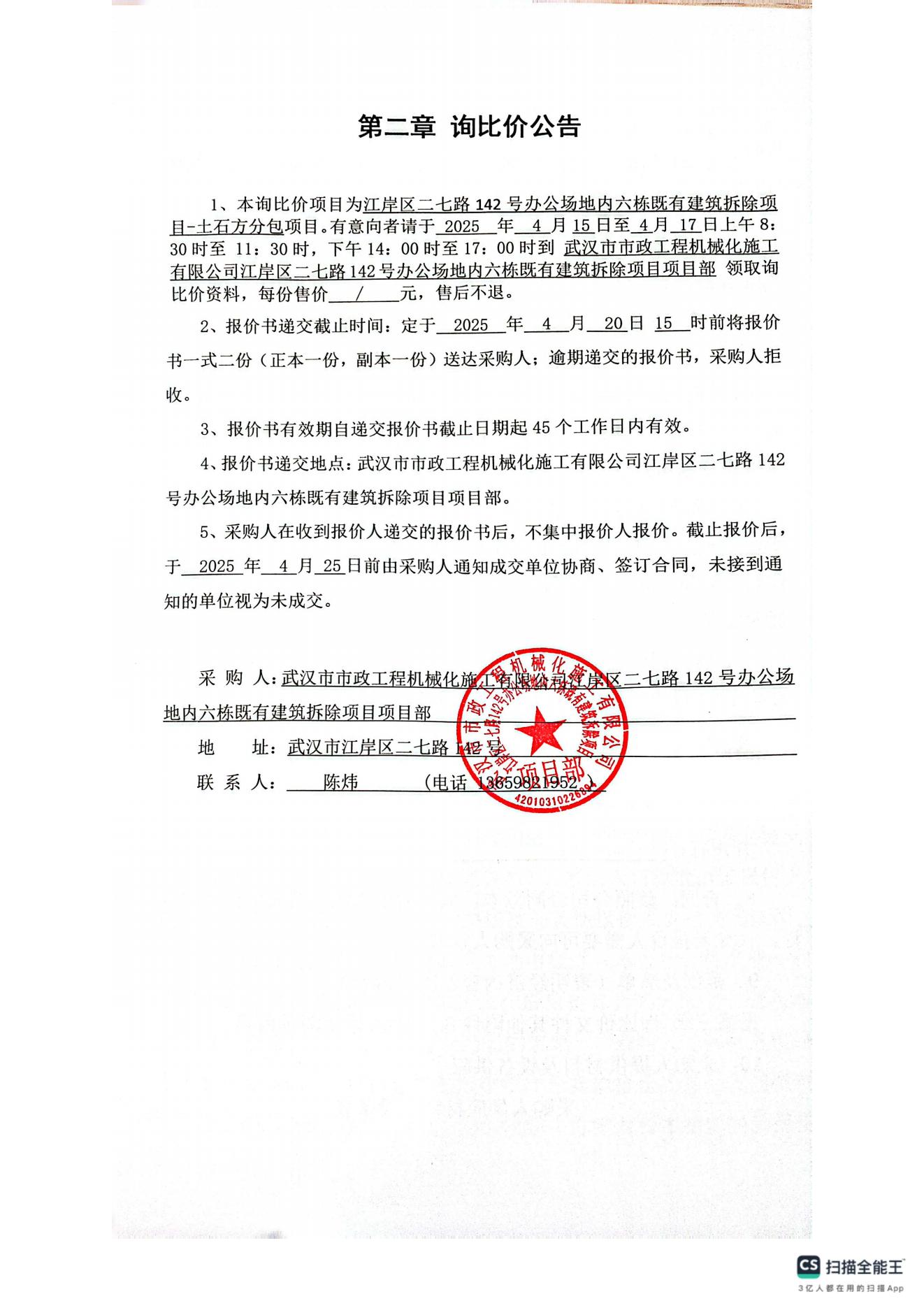 江岸區(qū)二七路142號辦公場地內六棟既有建筑拆除項目-土石方分包詢價公告
