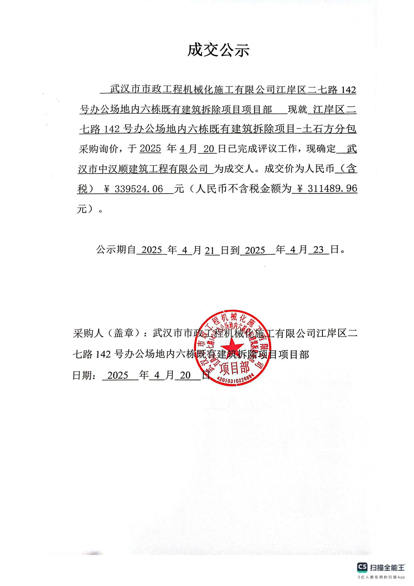 江岸區(qū)二七路142號辦公場地內(nèi)六棟既有建筑拆除項目-土石方分包成交公告
