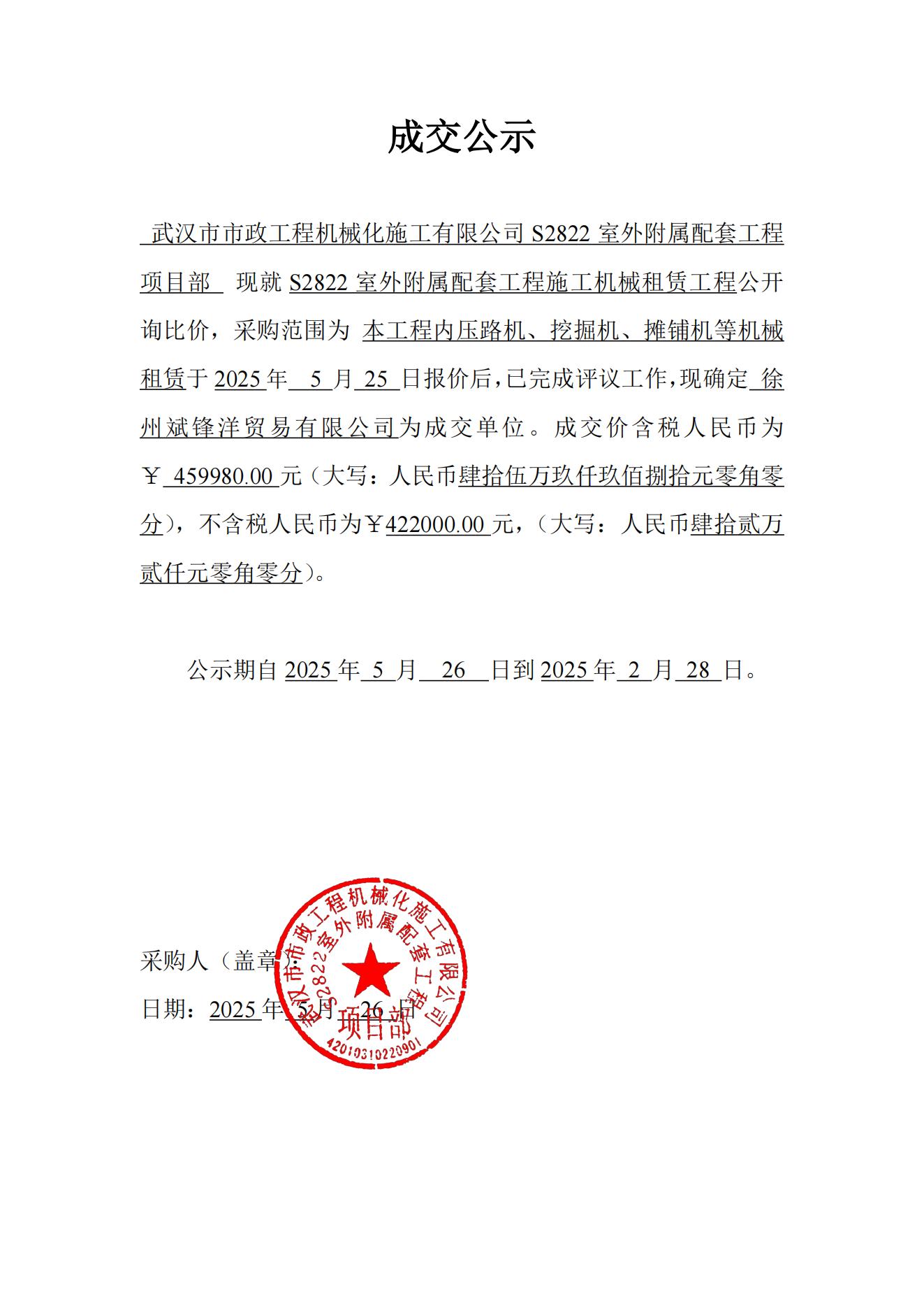 S2822室外附屬配套工程施工機(jī)械租賃工程成交公示