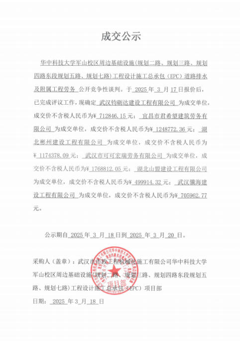 華中科技大學(xué)軍山校區(qū)周邊基礎(chǔ)設(shè)施(規(guī)劃二路、規(guī)劃三路、規(guī)劃四路東段規(guī)劃五路、規(guī)劃七路)工程設(shè)計施工總承包(EPC)道路排水及附屬工程勞務(wù)成交公示