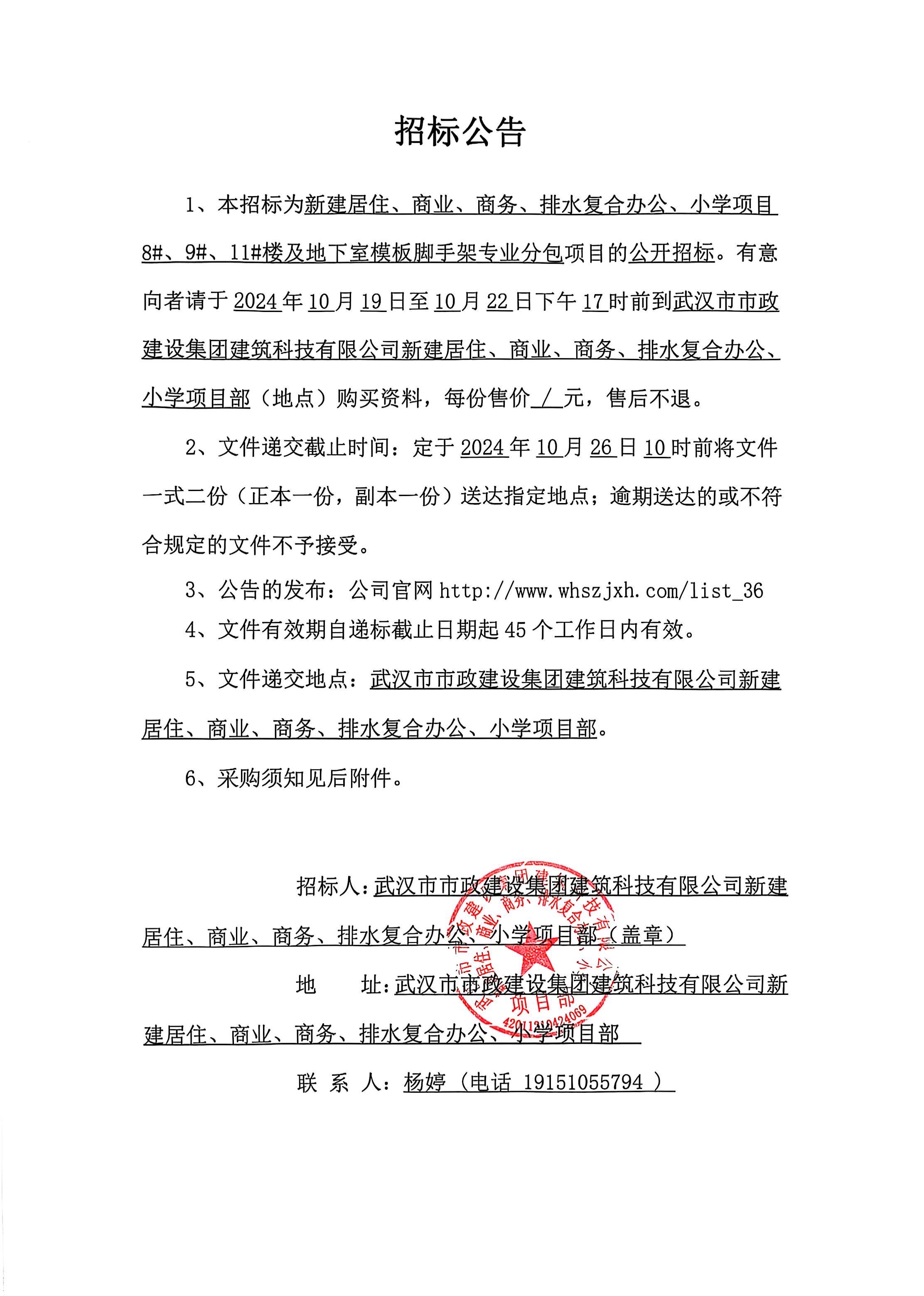 武漢市市政建設(shè)集團(tuán)建筑科技有限公司新建居住、商業(yè)、商務(wù)、排水復(fù)合辦公、小學(xué)項目8#、9#、11#樓及地下室模板腳手架專業(yè)分包招標(biāo)公告