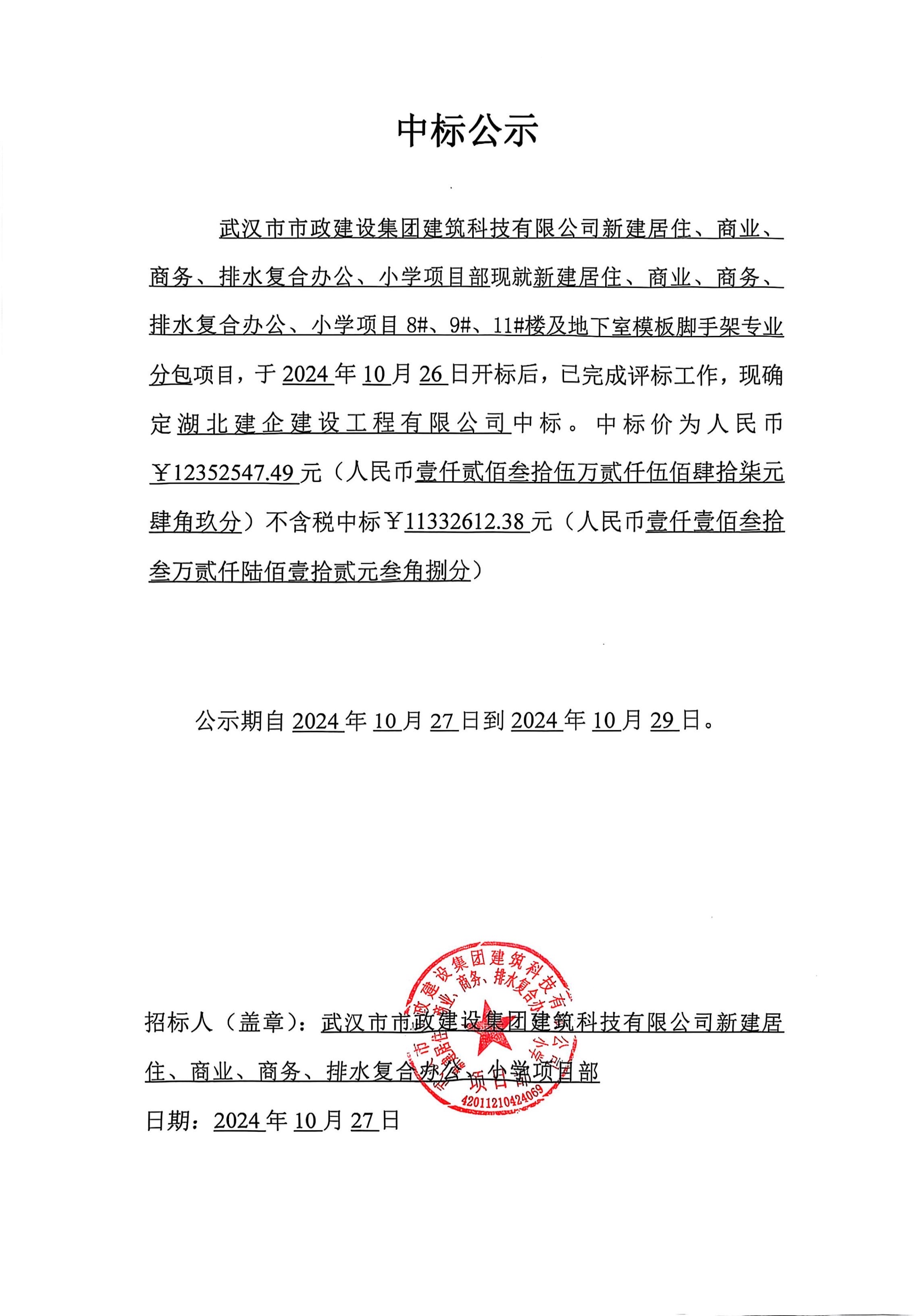 武漢市市政建設集團建筑科技有限公司新建居住、商業(yè)、商務、排水復合辦公、小學項目8#、9#、11#樓及地下室模板腳手架專業(yè)分包招標公示
