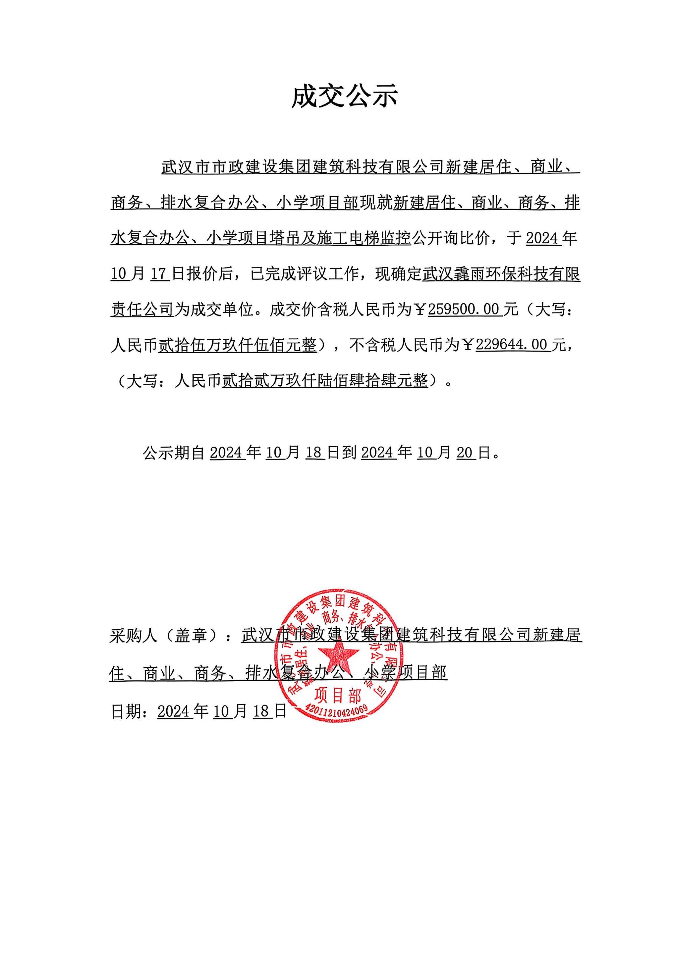 武漢市市政建設(shè)集團建筑科技有限公司新建居住、商業(yè)、商務(wù)、排水復(fù)合辦公、小學(xué)項目塔吊及施工電梯監(jiān)控成交公示