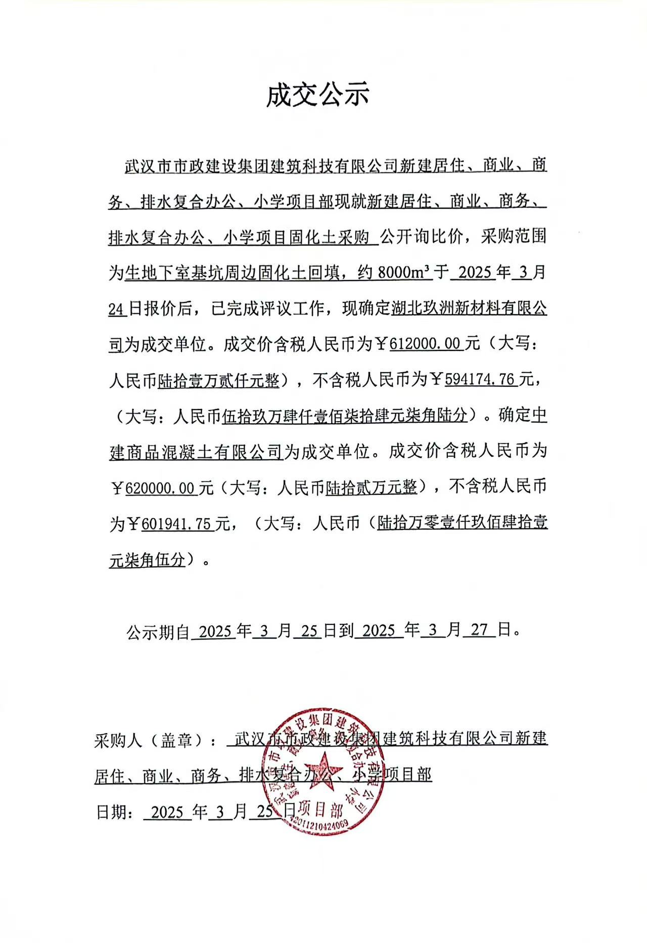 武漢市市政建設(shè)集團(tuán)建筑科技有限公司新建居住、商業(yè)、商務(wù)、排水復(fù)合辦公、小學(xué)項目固化土采購成交公示