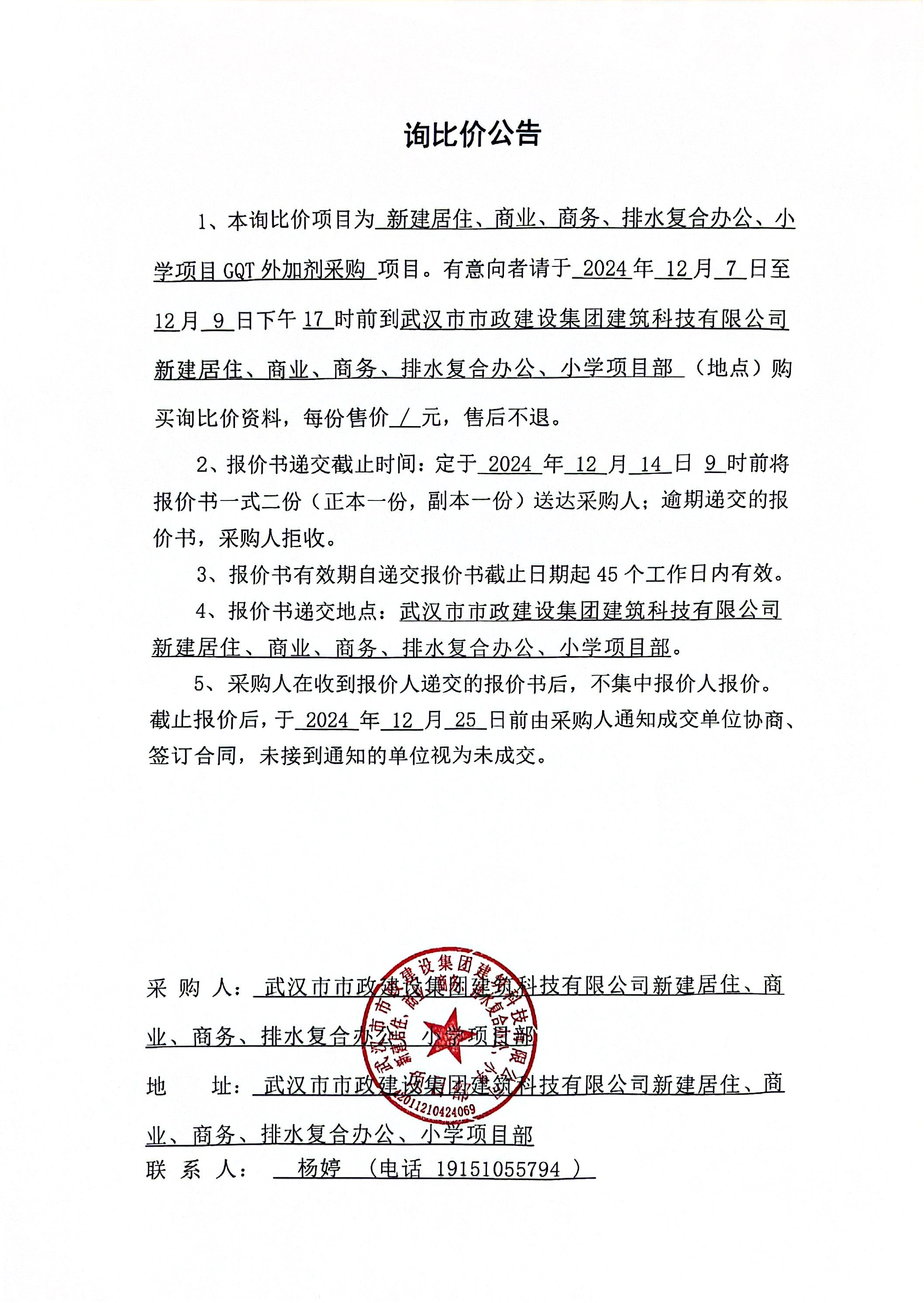 武漢市市政建設(shè)集團(tuán)建筑科技有限公司新建居住、商業(yè)、商務(wù)、排水復(fù)合辦公、小學(xué)項(xiàng)目GQT外加劑采購(gòu)詢價(jià)公告