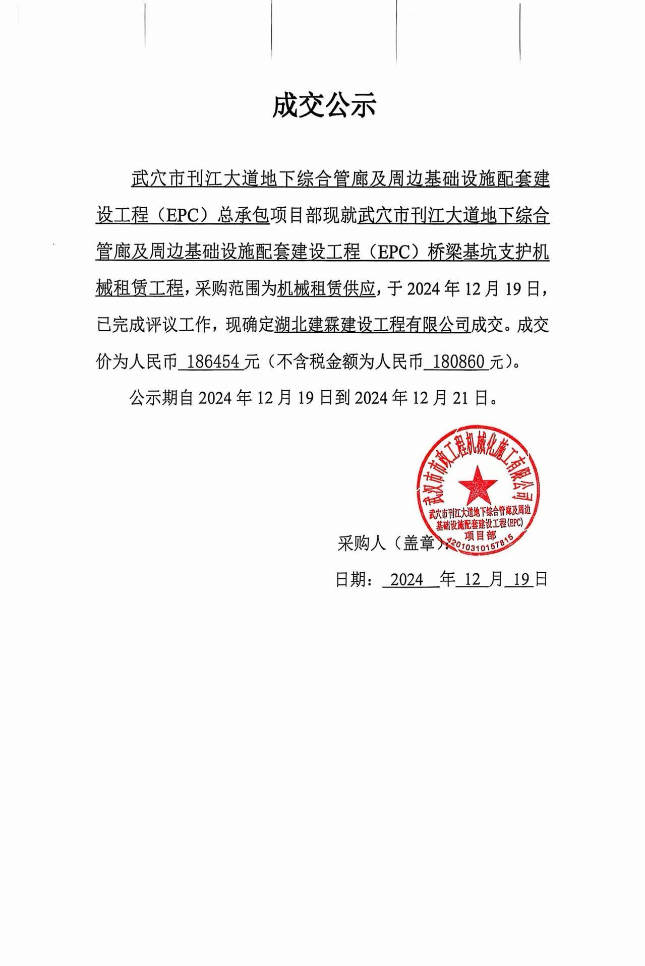 武穴市刊江大道地下綜合管廊及周邊基礎(chǔ)設(shè)施配套建設(shè)工程(EPC)橋梁基坑支護(hù)機(jī)械租賃工程成交公示