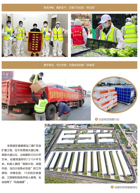 疫情期間 ,機(jī)施公司先后參與了37個(gè)抗疫應(yīng)急搶建任務(wù),平均每天建成一座“生命方舟”,累計(jì)提供床位16000余張,并先后向社會(huì)各界捐贈(zèng)抗疫捐款及防疫物資263萬元 ,成為集團(tuán)公司參與抗疫任務(wù)最多、 提供床位最多、對(duì)外捐贈(zèng)最多的單位,榮獲集團(tuán)“抗擊疫情立功單位”榮譽(yù)稱號(hào)。