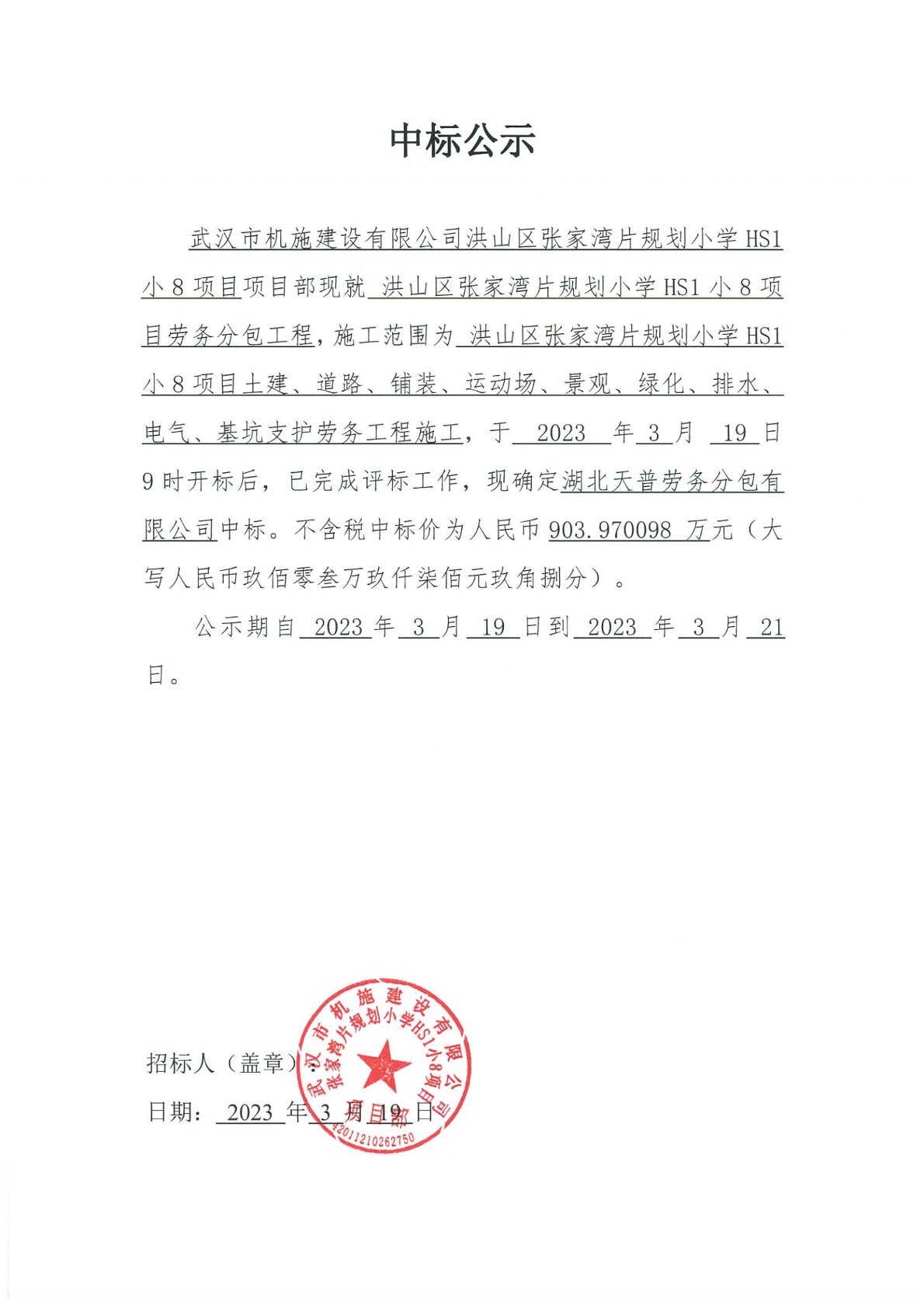 武漢市機施建設(shè)有限公司洪山區(qū)張家灣片規(guī)劃小學HS1小8項目勞務(wù)分包工程 中標公示