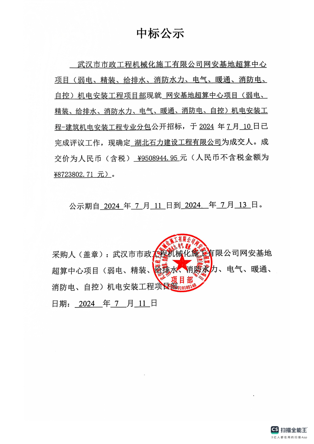 網(wǎng)安基地超算中心項(xiàng)目(弱電、精裝、給排水、消防水力、電氣、暖通、消防電、自控)機(jī)電安裝工程-建筑機(jī)電安裝工程專(zhuān)業(yè)分包中標(biāo)公示