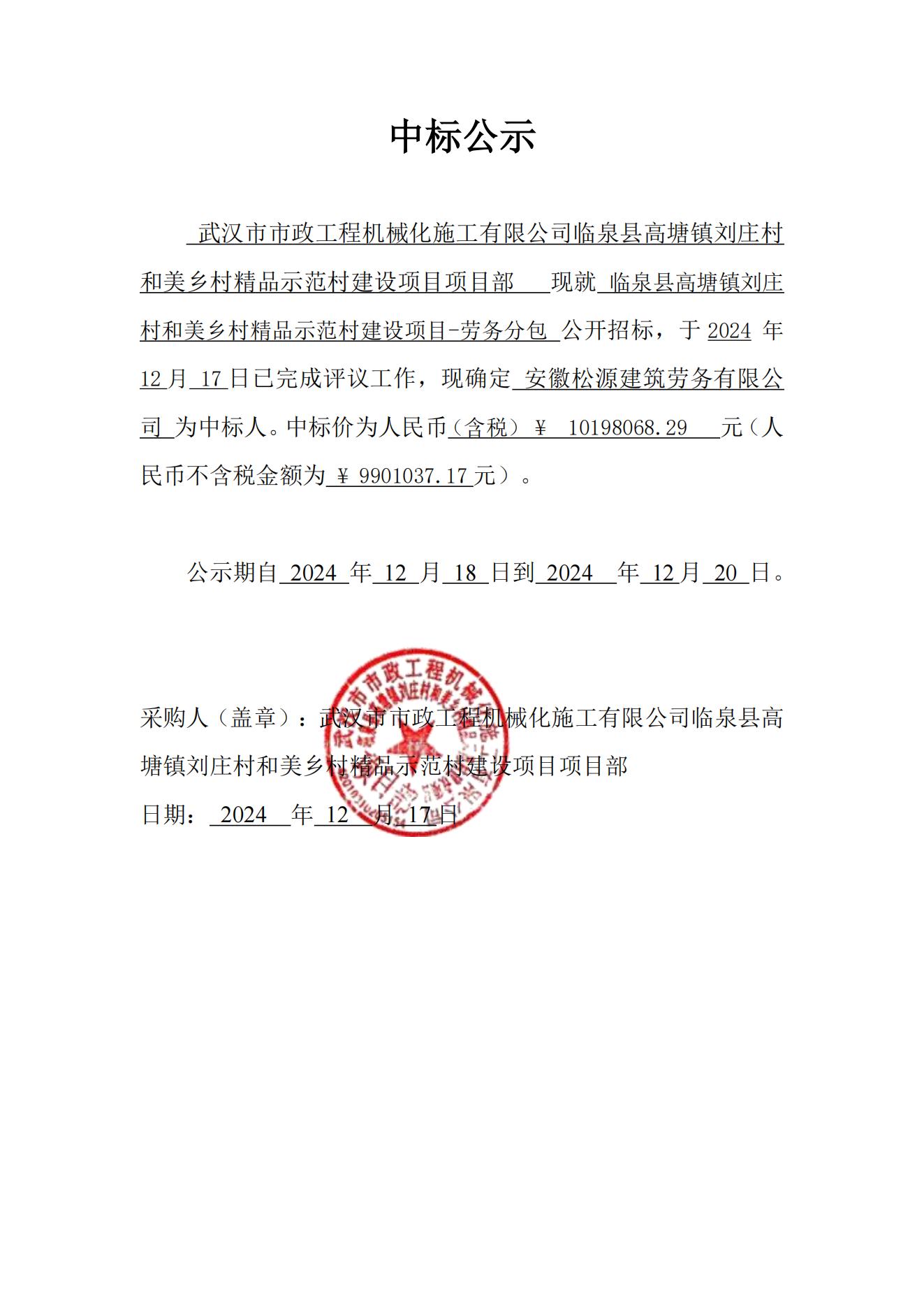 臨泉縣高塘鎮(zhèn)劉莊村和美鄉(xiāng)村精品示范村建設(shè)項目-勞務(wù)分包中標公示