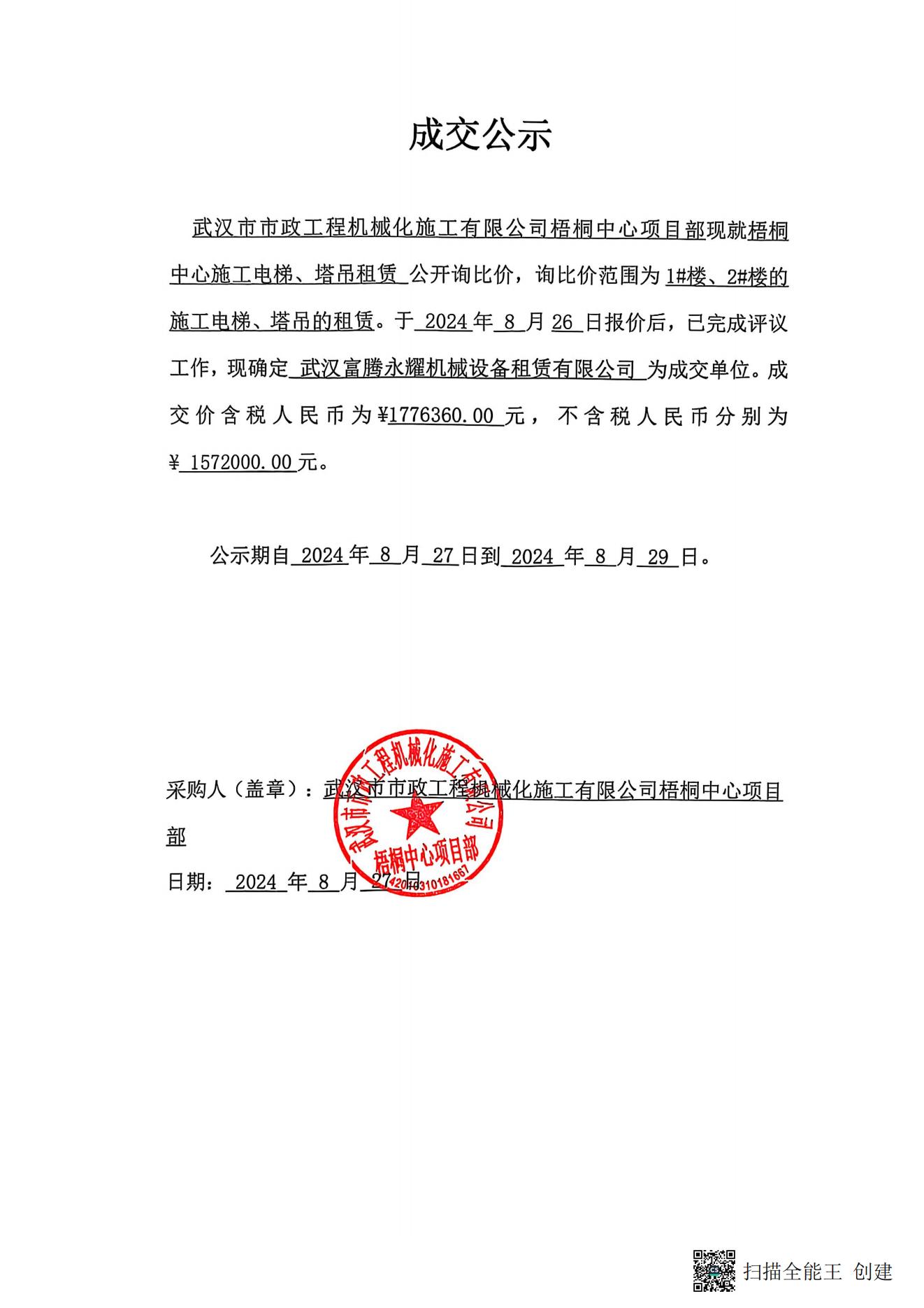 梧桐中心施工電梯、塔吊租賃成交公示