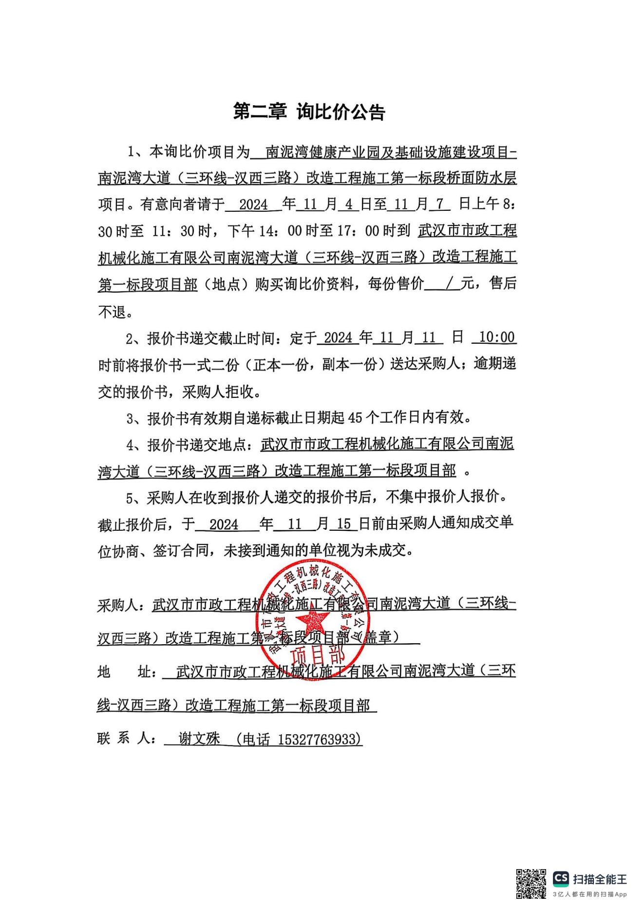 南泥灣健康產(chǎn)業(yè)園及基礎(chǔ)設(shè)施建設(shè)項目-南泥灣大道(三環(huán)線-漢西三路)改造工程施工第一標(biāo)段橋面防水層詢價公告