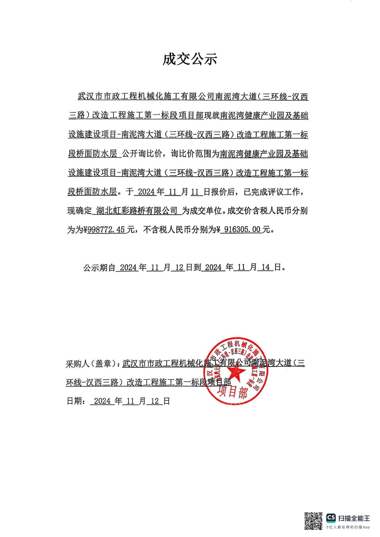南泥灣健康產(chǎn)業(yè)園及基礎(chǔ)設(shè)施建設(shè)項目-南泥灣大道(三環(huán)線-漢西三路)改造工程施工第一標(biāo)段橋面防水層成交公示