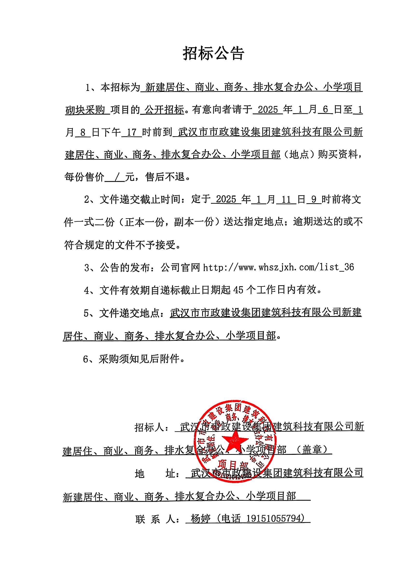 武漢市市政建設(shè)集團(tuán)建筑科技有限公司新建居住、商業(yè)、商務(wù)、排水復(fù)合辦公、小學(xué)項(xiàng)目砌塊采購(gòu)招標(biāo)公告