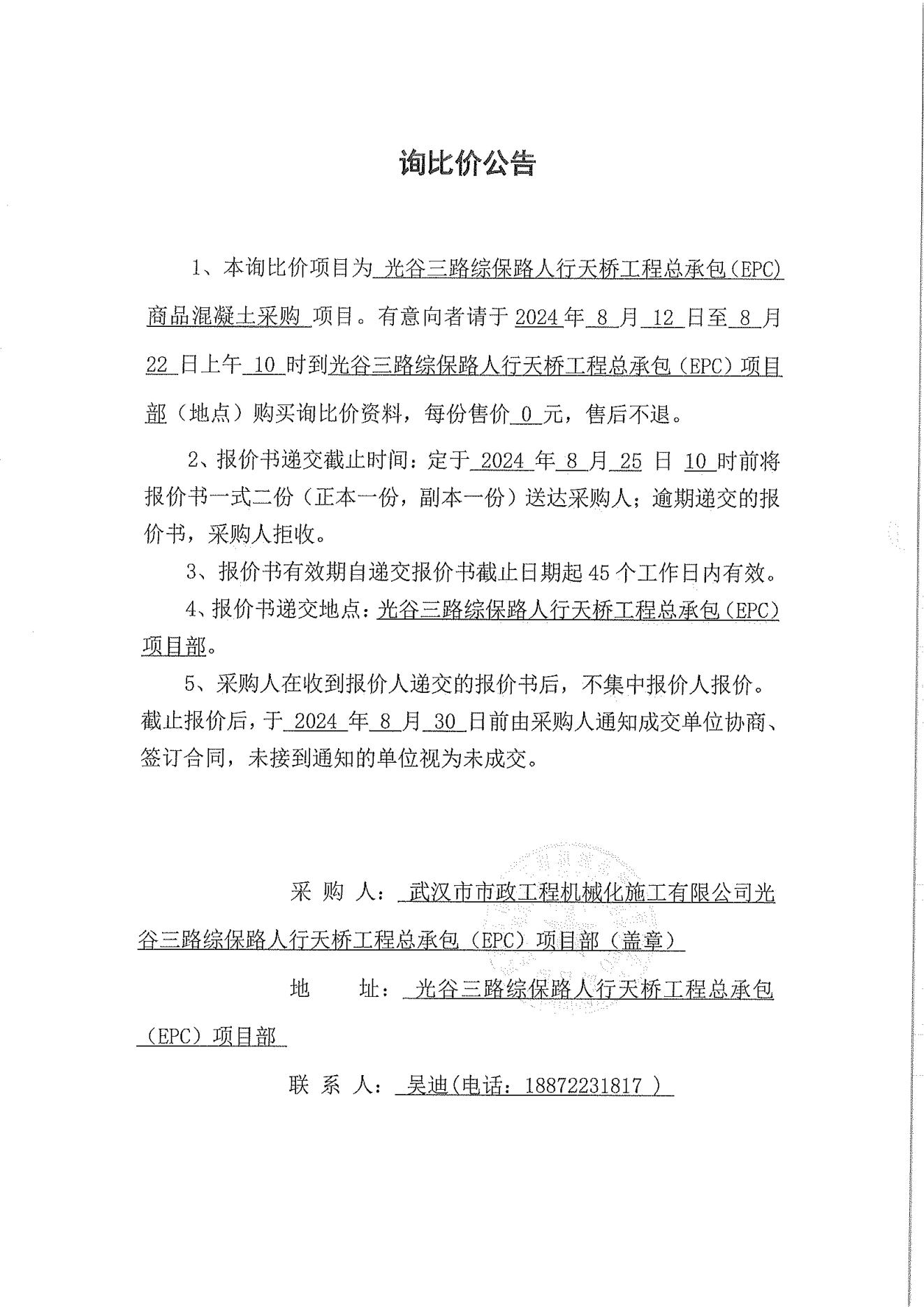 光谷三路綜保路人行天橋工程總承包(EPC)商品混凝土采購詢價(jià)公告