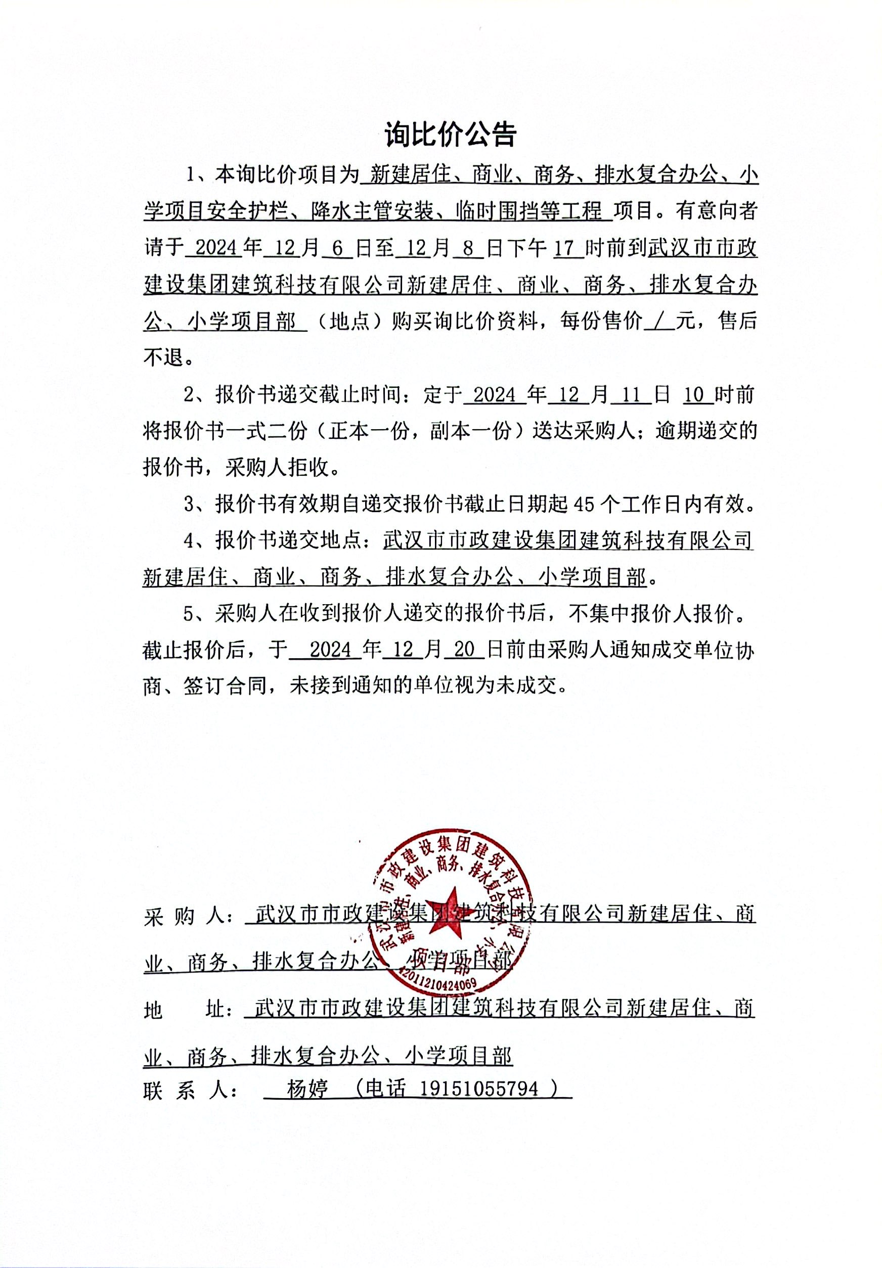 武漢市市政建設(shè)集團建筑科技有限公司新建居住、商業(yè)、商務(wù)、排水復(fù)合辦公、小學項目安全護欄、降水主管安裝、臨時圍擋等工程詢比公告