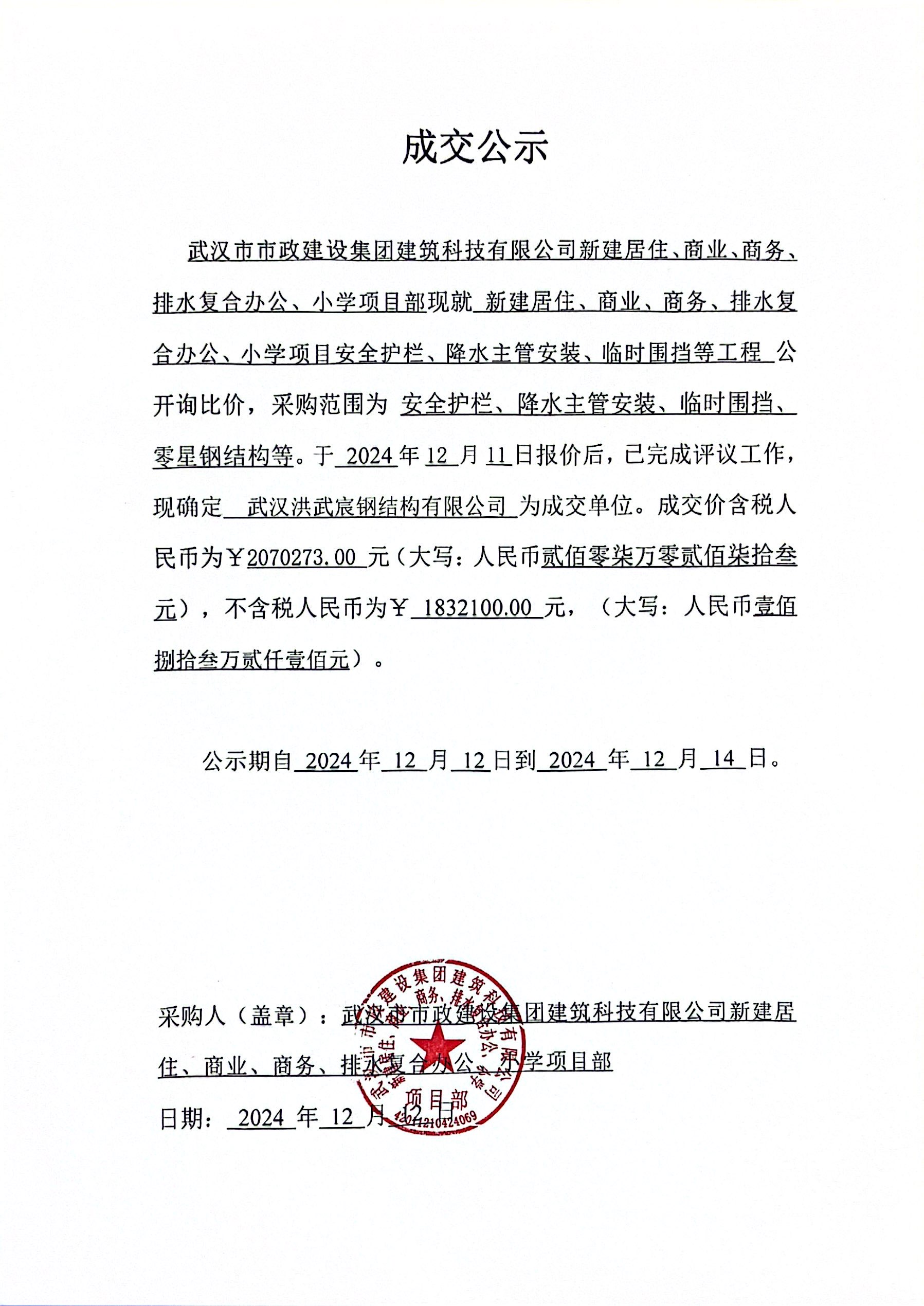 武漢市市政建設(shè)集團(tuán)建筑科技有限公司新建居住、商業(yè)、商務(wù)、排水復(fù)合辦公、小學(xué)項(xiàng)目安全護(hù)欄、降水主管安裝、臨時(shí)圍擋等工程成交公示