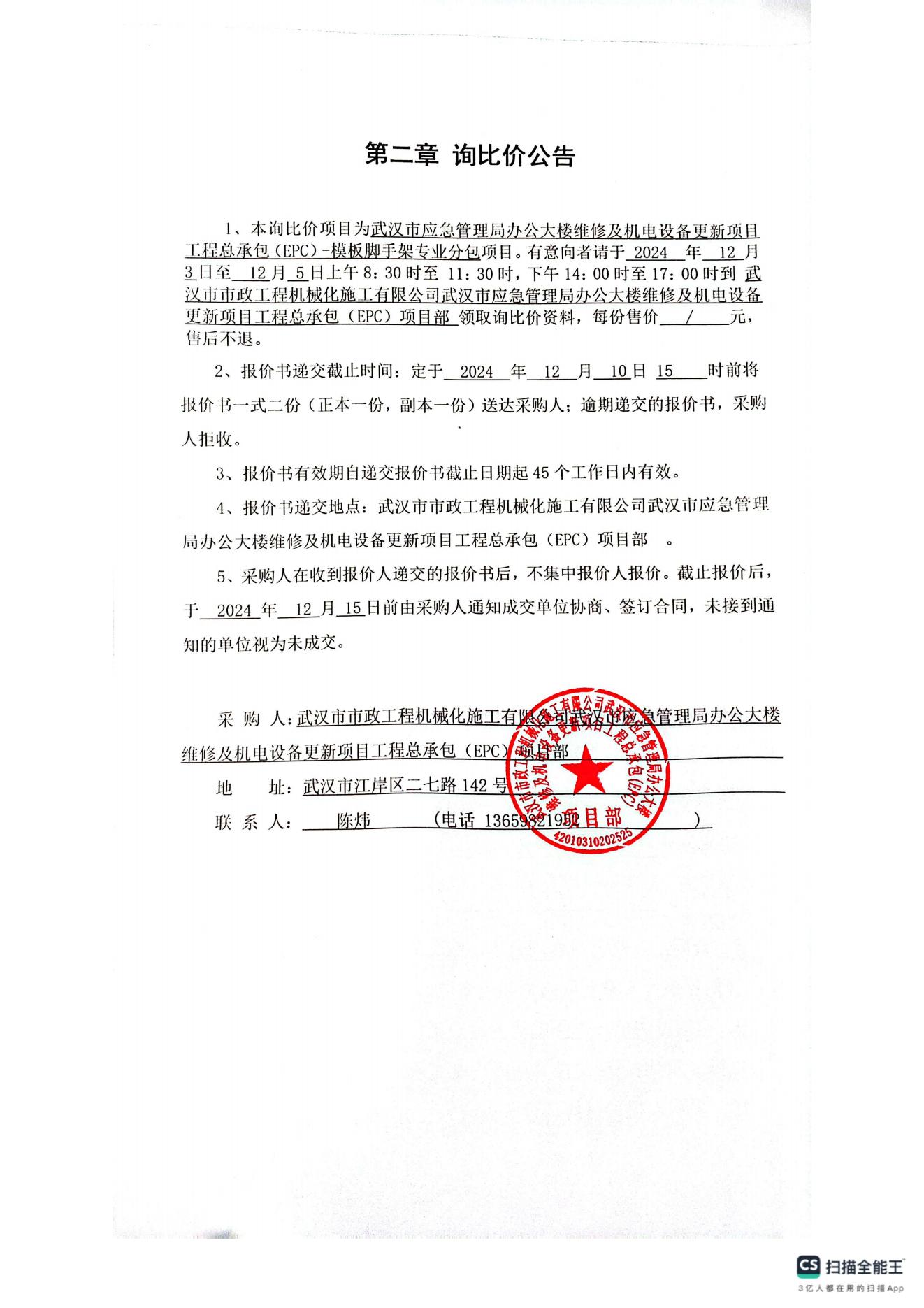 武漢市應(yīng)急管理局辦公大樓維修及機(jī)電設(shè)備更新項(xiàng)目工程總承包(EPC) -模板腳手架專業(yè)分包詢價(jià)公告