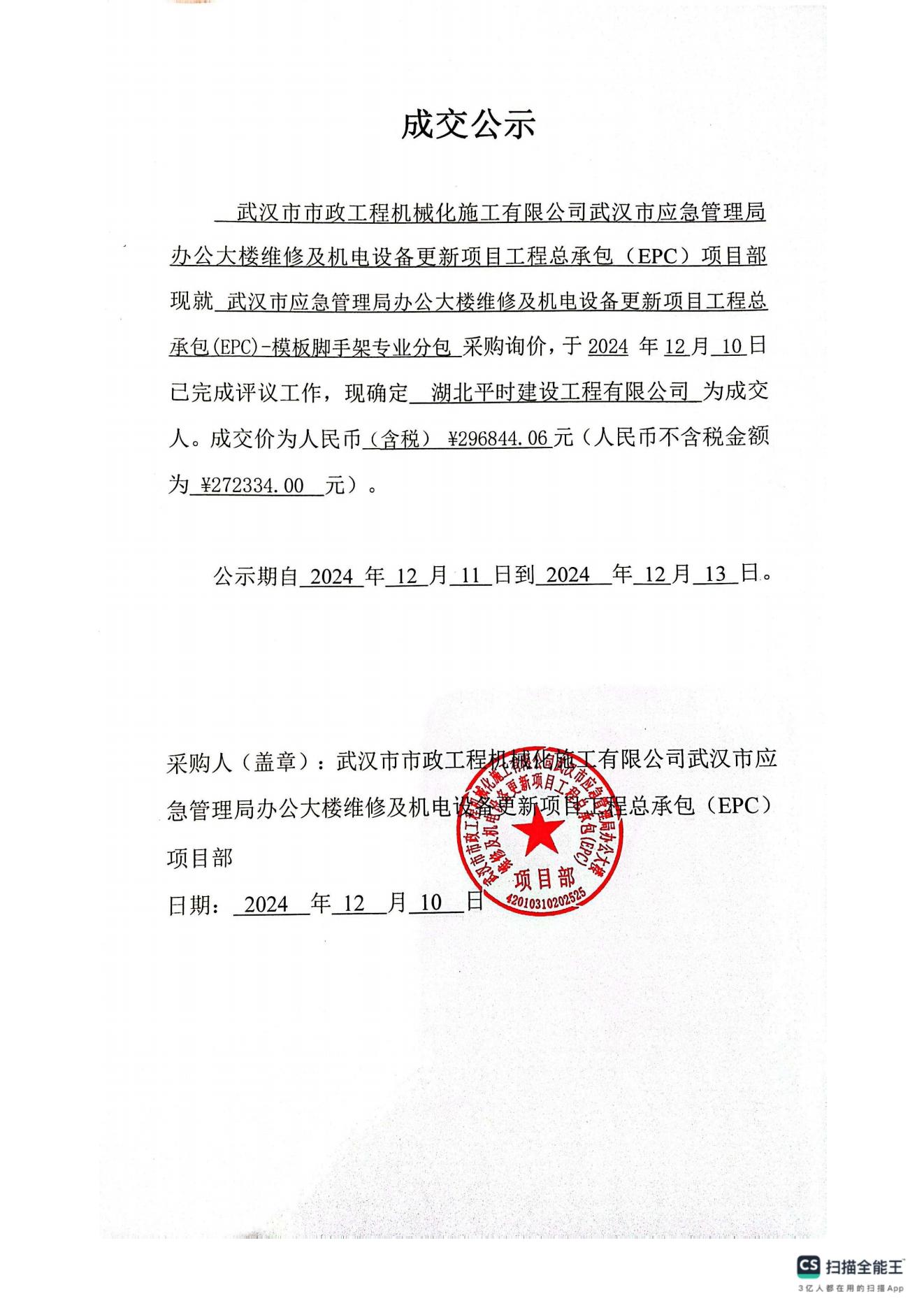 武漢市應(yīng)急管理局辦公大樓維修及機電設(shè)備更新項目工程總承包(EPC) -模板腳手架專業(yè)分包成交公示